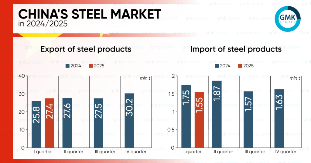 到 2024 年,中国的钢铁产量与 2023 年相比减少了 1.7%,至 10.05 亿吨。与此同时,出口量达到创纪录的 1.1072 亿吨,与 2023 年相比增长 22.7%。在国内消费疲软的情况下,这一数字继续增长。进口量为 680 万吨,同比下降 10.%%。